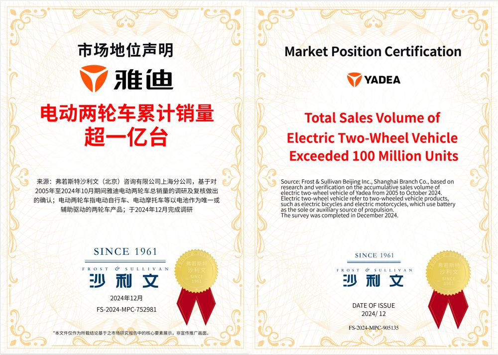 12月10日,全球中(zhōng)短途出行領導者雅迪召開了“全面領先 共赢未來”雅迪科(kē)技(jì )集團2025年全球零售峰會。大會正式公(gōng)布“雅迪全球市場電(diàn)動車(chē)累計銷售突破1億台”。由此,雅迪成為(wèi)全球新(xīn)能(néng)源出行領域首個銷量突破1億台的品牌。